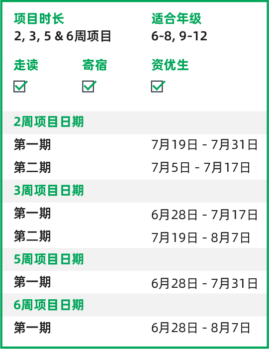 高中项目让学生有机会向商界与娱乐界的实战领袖学习,可尝试创作剧本、钻研机器人、探索时尚设计、了解体育商业的职路,或涉足法律、医学等专业方向,选择丰富多元。初中项目平衡了拓展课程与大学生活初体验,而“天才学院”则让有天赋的学生能与志同道合的同伴一起,深入追求学术热情。